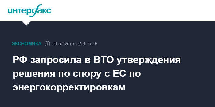 Москва. 24 августа. INTERFAX.RU - Россия запросила Всемирную торговую организацию (ВТО) вынести одобрение решения третейской группы по спору с ЕС по энергокорректировкам, рассмотрение намечено на конец августа, заявил в интервью "Интерфаксу" глава Минэкономразвития Максим Решетников.