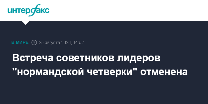 Москва. 25 августа. INTERFAX.RU - Запланированная на 28 августа встреча советников глав государств "нормандского формата" отменена из-за разногласий по итоговым документам, сообщил "Интерфаксу" источник, близкий к переговорам.