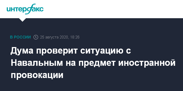 Москва. 25 августа. INTERFAX.RU - Комитет Госдумы по безопасности и противодействию коррупции проверит обстоятельства произошедшего с оппозиционером Алексеем Навальным на предмет вмешательства иностранных государств, заявил во вторник спикер нижней палаты парламента Вячеслав Володин.