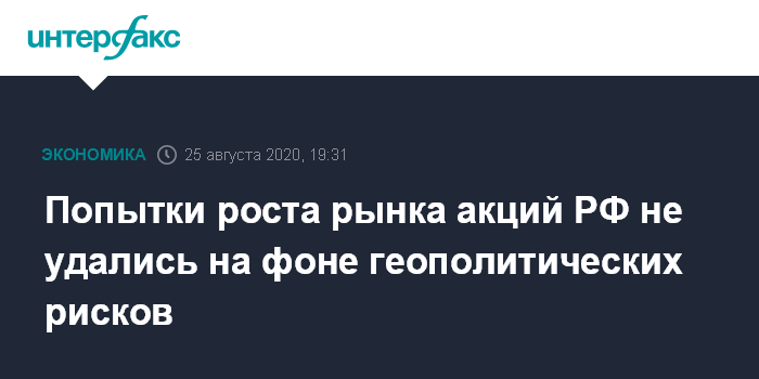 Москва. 25 августа. INTERFAX.RU - Попытки рынка акций РФ подрасти во вторник вслед за мировыми площадками на надеждах на лечение коронавируса COVID-19 нивелировались геополитическими рисками - из-за опасений возможных новых западных санкций на фоне политического кризиса в Белоруссии; лидерами роста вновь выступили акции "Яндекса" после их вхождения в топ-4 индекса MSCI Russia 10/40 с весом 9,44%.