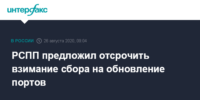 Москва. 26 августа. INTERFAX.RU - Российский союз промышленников и предпринимателей (РСПП) предложил отсрочить взимание инвестиционного портового сбора (ИПС) минимум до лета 2021 года, пишет "Коммерсантъ" со ссылкой на протокол совещания от 19 августа, которое глава РСПП Александр Шохин провел со стивидорами и экспортерами грузов.