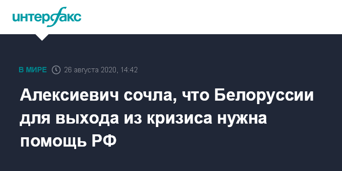 Москва. 26 августа. INTERFAX.RU - Нобелевский лауреат по литературе Светлана Алексиевич считает, что политический кризис в Белоруссии может разрешиться при участии мирового сообщества и России.