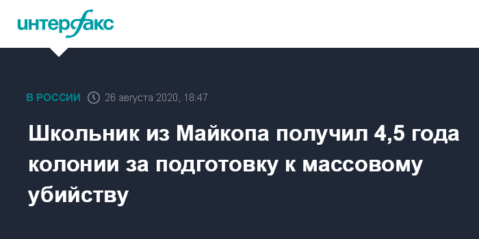 Пресс-служба прокуратуры Адыгеи сообщила, что несовершеннолетний учащийся общеобразовательной школы в Майкопе "готовился к совершению убийства неограниченного круга лиц в учебном заведении города". Он купил "необходимые предметы", которые планировал использовать в качестве взрывного устройства, говорится в сообщении.