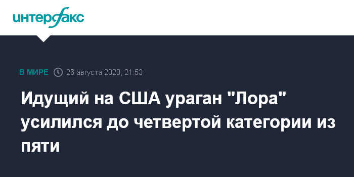 Москва. 26 августа. INTERFAX.RU - Ураган "Лора", бушующий в Мексиканском заливе, усилился и достиг четвертой - предпоследней по опасности - категории. Об этом сообщили в Национальном центре США по предупреждению ураганов в среду.
