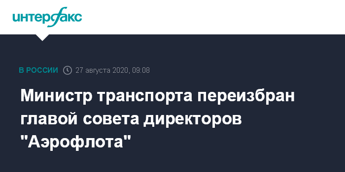 Москва. 27 августа. INTERFAX.RU - Глава Минтранса Евгений Дитрих переизбран председателем совета директоров "Аэрофлота". Как сообщила компания, это решение было принято на заседании совета в минувшую среду.