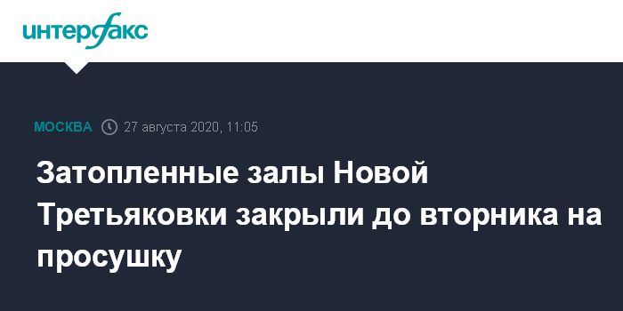 Закрыты будут постоянная экспозиция Новой Третьяковки, выставки "НЕНАВСЕГДА. 1968-1985" и "Шедевры из Казани. От Рериха до Кандинского. К 100-летию Республики Татарстан", сообщает корреспондент "Интерфакса". Эти залы нужно просушить.