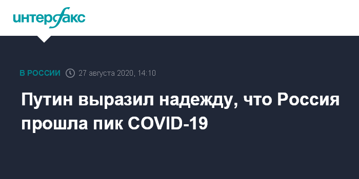 Москва. 27 августа. INTERFAX.RU - Президент России Владимир Путин выразил надежду, что пиковая отметка заболеваемости коронавирусом в России уже пройдена.