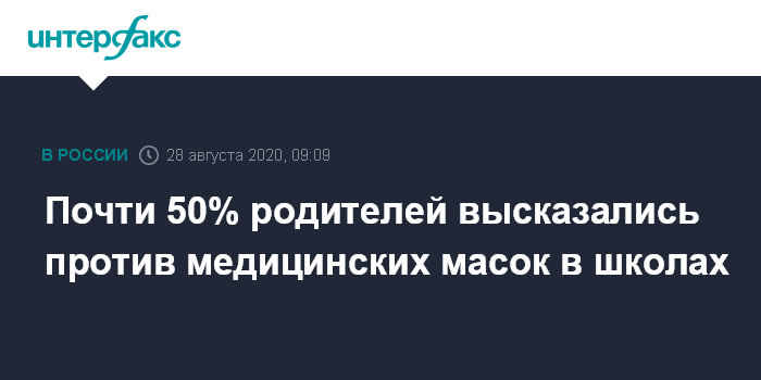 Москва. 28 августа. INTERFAX.RU - Почти половина (47%) родителей, имеющих детей школьного возраста, высказались против ношения учениками медицинских масок в школах, свидетельствуют данные опроса исследовательского центра портала Superjob.ru, поступившие в пятницу в "Интерфакс".