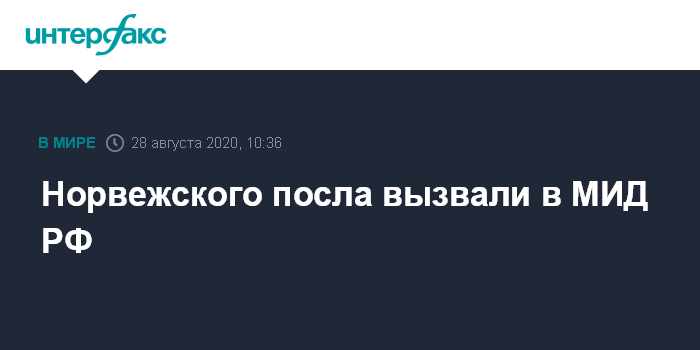 Москва. 28 августа. INTERFAX.RU - Посол Норвегии в России Рюне Ресаланд в пятницу вызван в МИД РФ, сообщили "Интерфаксу" в российском внешнеполитическом ведомстве.