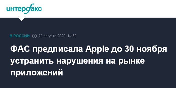 Москва. 28 августа. INTERFAX.RU - Федеральная антимонопольная служба (ФАС) России сообщила, что выдала Apple предписание устранить до 30 ноября нарушения, ограничивающие конкуренцию на рынке приложений для мобильных устройств под управлением iOS.