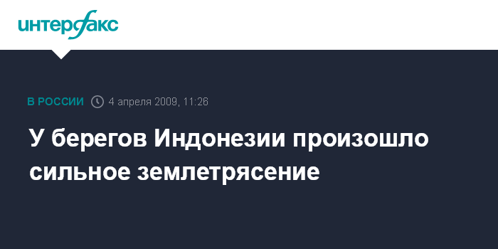 Москва. 4 апреля. INTERFAX.RU - Землетрясение мощностью в 6,5 балла по шкале Рихтера произошло в субботу у берегов Индонезии, информирует местный Национальный центр метеорологии и геофизики.
