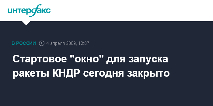 Москва. 4 апреля. INTERFAX.RU - Северная Корея не провела в субботу запуск ракеты в первое заявленное стартовое окно, передает британская телерадиокорпорация Би-Би-Си.