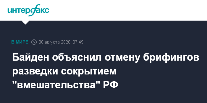 Москва. 30 августа. INTERFAX.RU - Кандидат в президенты США от Демократической партии Джо Байден считает, что решение главы национальной разведки прекратить брифинги для членов комитетов по разведке Конгресса преследует цель скрыть якобы существующее вмешательство России в американские выборы.