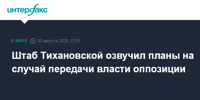 Москва. 30 августа. INTERFAX.RU - Лидер белорусской оппозиции Светлана Тихановская намерена восстановить конституцию 1994 года и сформировать временное правительство на основе действующего, сообщили "Интерфаксу" в ее штабе в воскресенье.