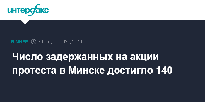 Москва. 30 августа. INTERFAX.RU - Число задержанных на акции протеста в воскресенье в Минске, по данным на 18:00 местного времени, достигло 140 человек, сообщила агентству "Интерфакс" официальный представитель МВД Белоруссии Ольга Чемоданова.