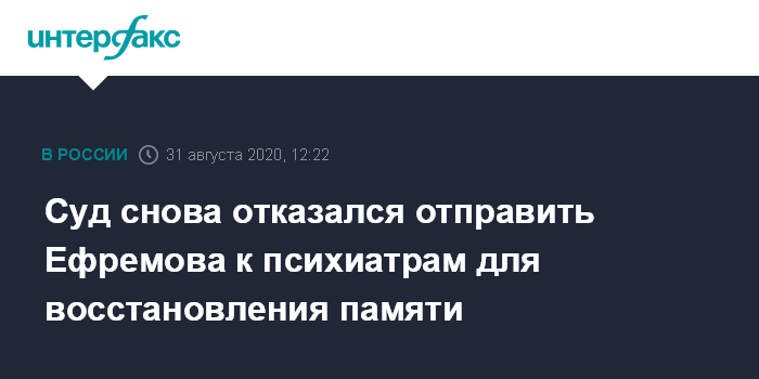 Москва. 31 августа. INTERFAX.RU - Адвокаты актера Михаила Ефремова, устроившего смертельное ДТП в центре Москвы, попросили отправить артиста на лечение, где ему восстановят память, передает корреспондент "Интерфакса" из зала суда в понедельник.