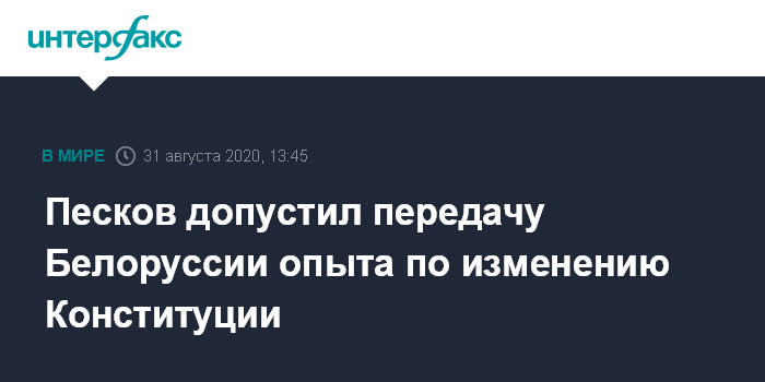 Москва. 31 августа. INTERFAX.RU - Россия может поделиться с Белоруссией недавним опытом по изменению Конституции, допустил пресс-секретарь президента Путина Дмитрий Песков. Белорусский лидер Александр Лукашенко в последнее время говорит о подготовке новой Конституции страны.