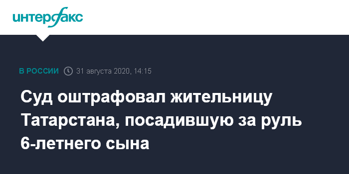 Москва. 31 августа. INTERFAX.RU - Елабужский городской суд Татарстана в понедельник оштрафовал женщину, посадившую за руль автомобиля маленького сына, сообщает пресс-служба СУ СКР по региону.