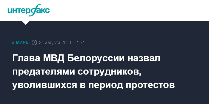 Москва. 31 августа. INTERFAX.RU - Сотрудники милиции, которые в период протестов в Белоруссии уволились и присоединились к акциям, являются предателями, считает глава МВД республики Юрий Караев.