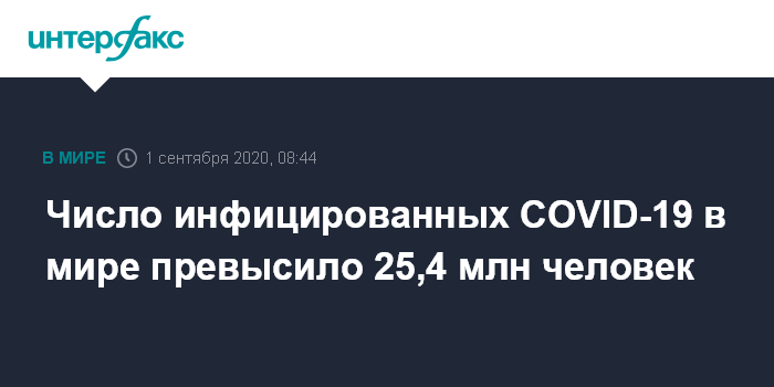 Москва. 1 сентября. INTERFAX.RU - С начала пандемии коронавируса СOVID-19 число инфицированных в мире по состоянию на 08:00 по Москве вторника достигло 25 484 767 человек, увеличившись за сутки на 262 058, свидетельствуют данные американского университета Джонса Хопкинса.