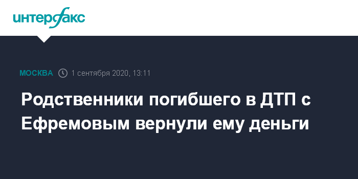 Москва. 1 сентября. INTERFAX.RU - Потерпевшие по делу о смертельном ДТП с участием актера Михаила Ефремова отказались от компенсации в виде 200 тысяч рублей каждому, которые ранее артист отправил по почте.