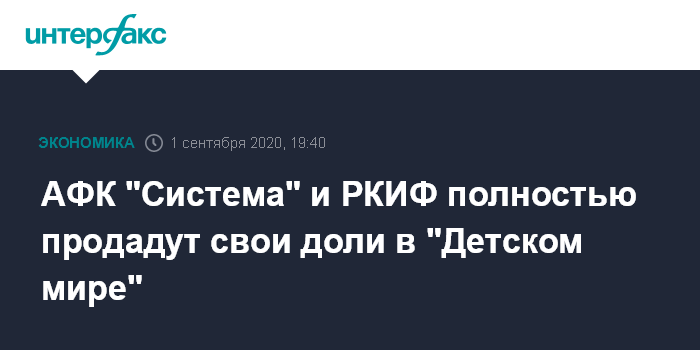 Москва. 1 сентября. INTERFAX.RU - ПАО АФК "Система" совместно с Российско-китайским инвестиционным фондом (РКИФ, создан РФПИ и China Investment Corporation) объявили о продаже своих долей в ПАО "Детский мир".