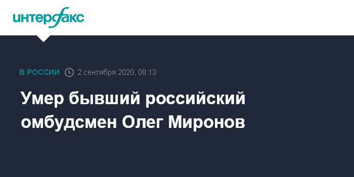 Москва. 2 сентября. INTERFAX.RU - Умер первый российский уполномоченный по правам человека, юрист, бывший депутат Госдумы Олег Миронов. Об этом в соцсетях сообщила омбудсмен Татьяна Москалькова. Ему был 81 год.