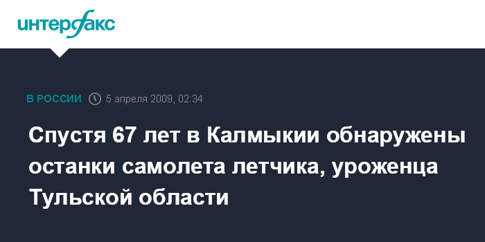 Тула. 5 апреля. ИНТЕРФАКС-ЦЕНТР - Под поселком Хулхута Яшкульского района Республики Калмыкия поисковиками найдены останки самолета, которым во время Великой Отечественной войны управлял уроженец Тульской области Александр Буданов.