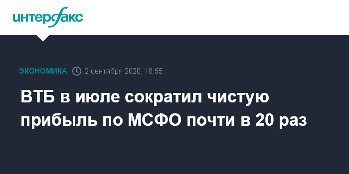 Москва. 2 сентября. INTERFAX.RU - ВТБ в июле 2020 года получил чистую прибыль по МСФО в размере 1,1 млрд рублей против 20,5 млрд рублей за тот же месяц 2019 года, сообщил банк в среду.