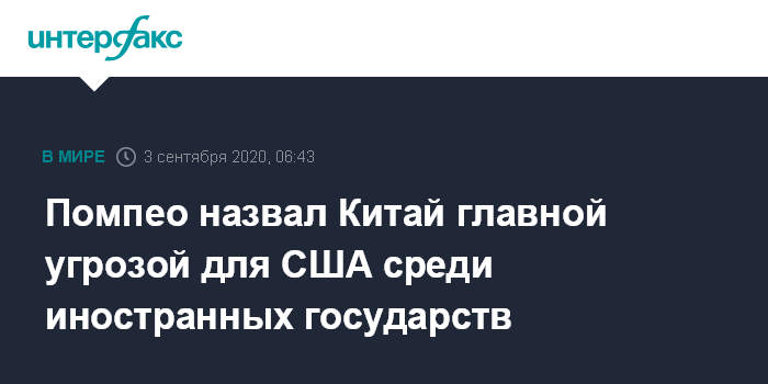 Москва. 3 сентября. INTERFAX.RU - Госсекретарь США Майк Помпео считает, что Китай представляет большую угрозу для США, чем Россия, об этом он заявил в интервью Fox News.