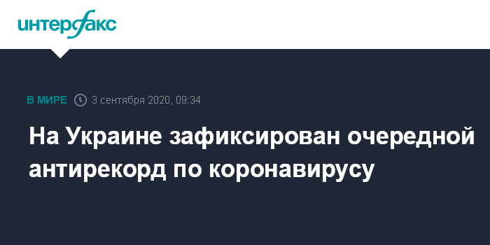 Москва. 3 сентября. INTERFAX.RU - На Украине зафиксирован очередной антирекорд: 54 умерших от COVID-19 за сутки. При этом на утро четверга выявлено 2 430 инфицированных коронавирусом за сутки, 859 человек из числа ранее заболевших выздоровели, свидетельствуют данные, опубликованные на сайте Системы мониторинга распространения эпидемии коронавируса Совета национальной безопасности и обороны (СНБО).