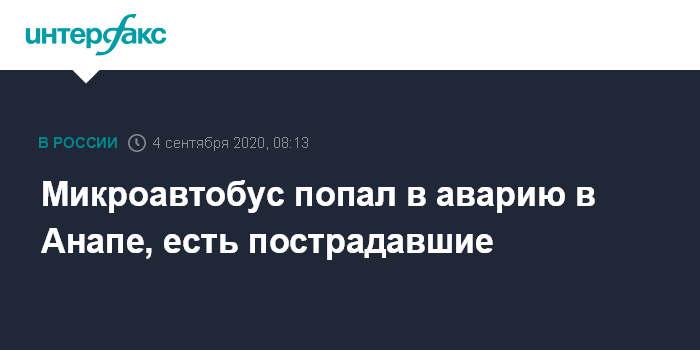 Москва. 4 сентября. INTERFAX.RU - В Анапе утром в пятницу произошло ДТП с участием пассажирского микроавтобуса. Как сообщил информированный источник "Интерфакса", пострадали по меньшей мере шесть человек.