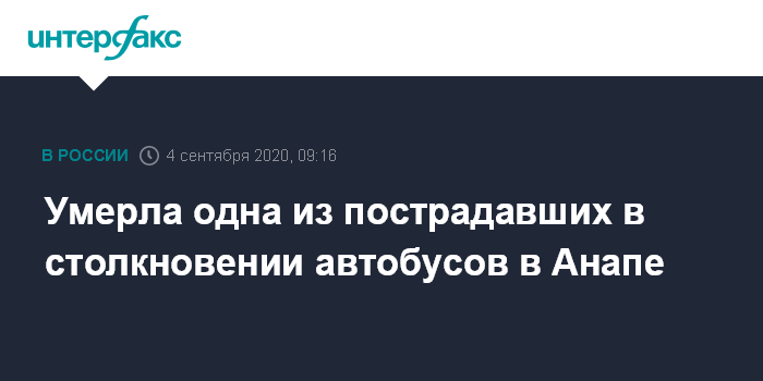 Москва. 4 сентября. INTERFAX.RU - В Анапе умерла женщина, пострадавшая при столкновении двух микроавтобусов, сообщили в прокуратуре Краснодарского края. Там отметили, что она поступила в больницу в крайне тяжелом состоянии.