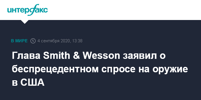 Москва. 4 сентября. INTERFAX.RU - Гендиректор Smith & Wesson Марк Смит заявил о "во многом беспрецедентном" росте спроса на огнестрельное оружие в США. Он сказал об этом аналитикам, пишет Financial Times.