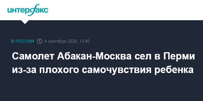 Москва. 4 сентября. INTERFAX.RU - Самолет, летевший из Абакана в Москву, совершил незапланированную посадку в международном аэропорту "Пермь" (Большое Савино) из-за плохого самочувствия младенца, сообщили "Интерфаксу" в пресс-службе регионального Минздрава в пятницу.