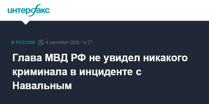 Москва. 4 сентября. INTERFAX.RU - Глава МВД России Владимир Колокольцев считает, что в ситуации с оппозиционером Алексеем Навальным нет криминала.