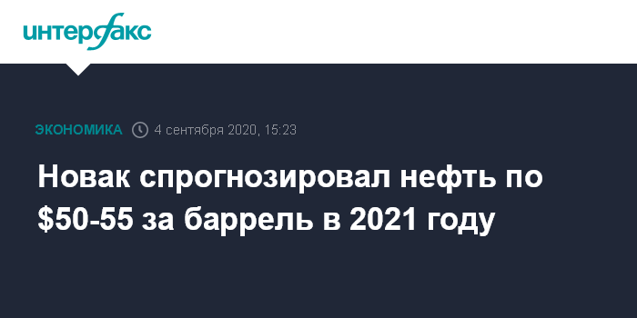 Москва. 4 сентября. INTERFAX.RU - Цена на нефть в 2021 году, скорее всего, будет на уровне $50-55 за баррель, считает министр энергетики РФ Александр Новак.