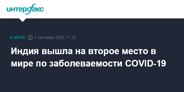 Москва. 7 сентября. INTERFAX.RU - В Индии число заразившихся коронавирусом превысило 4,2 млн человек, за минувшие сутки в стране было выявлено 90 802 новых случая, сообщает АР со ссылкой на данные университета Джонса Хопкинса. Страна вышла на второе место в мире по заболеваемости COVID-19.