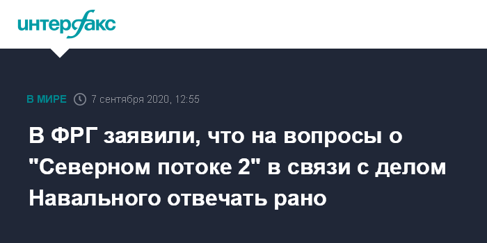 Москва. 7 сентября. INTERFAX.RU - Представитель кабмина ФРГ Штеффен Зайберт заявил, что на вопросы о завершении строительства "Северного потока 2" в связи с делом об отравлении российского оппозиционера Алексея Навального отвечать пока слишком рано.