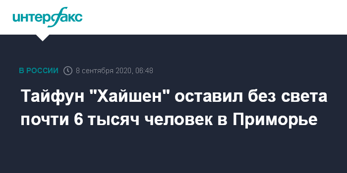 Москва. 8 сентября. INTERFAX.RU - Энергоснабжение 17 населенных пунктов в Приморье нарушено из-за тайфуна "Хайшен", там без света остались около 5 870 человек, сообщает ситуационно-аналитический центр Минэнерго РФ.