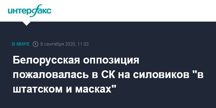Москва. 8 сентября. INTERFAX.RU - Координационный совет белорусской оппозиции направил в Следственный комитет заявления с жалобами на непропорциональное насилие в отношении к протестующим и в том числе "на агрессию людей в штатском и масках", которые задерживали людей в Минске. Об этом сообщил член президиума совета Максим Знак.