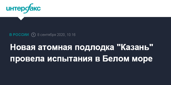 Москва. 8 сентября. INTERFAX.RU - Новая российская многоцелевая атомная подлодка "Казань" провела ходовые испытания в Белом море, сообщила пресс-служба Северного флота (СФ) во вторник.