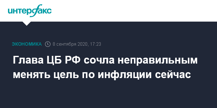 Москва. 8 сентября. INTERFAX.RU - Менять цель по инфляции сейчас было бы неправильным, это может снизить доверие к денежно-кредитной политике (ДКП), считает председатель Банка России Эльвира Набиуллина.