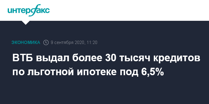 Москва. 9 сентября. INTERFAX.RU - Банк ВТБ сообщил, что выдал россиянам более 30 тыс. кредитов на 90 млрд рублей по льготной программе ипотеки под 6,5% годовых. Программа была запущена в апреле по поручению президента Владимира Путина и будет действовать до ноября.