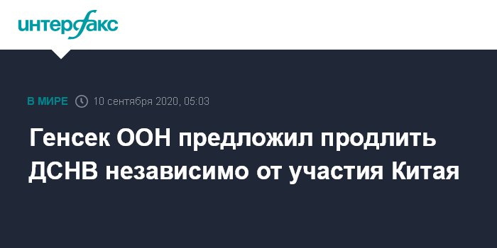 Москва. 10 сентября. INTERFAX.RU - Генеральный секретарь ООН Антониу Гутерриш заявил, что Договор о стратегических наступательных вооружениях (ДСНВ) между США и Россией должен быть продлен независимо от того, присоединится ли к нему Китай.