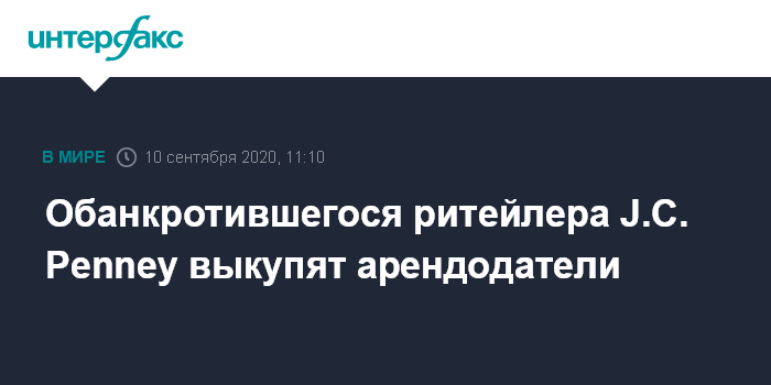 Москва. 10 сентября. INTERFAX.RU - Два крупнейших владельца торговых комплексов в США - Simon Property Group Inc. и Brookfield Property Partners LP - договорились о покупке за $800 млн американской сети универмагов J.C. Penney Co., объявившей о банкротстве. Об этом сообщила пресс-служба ритейлера.