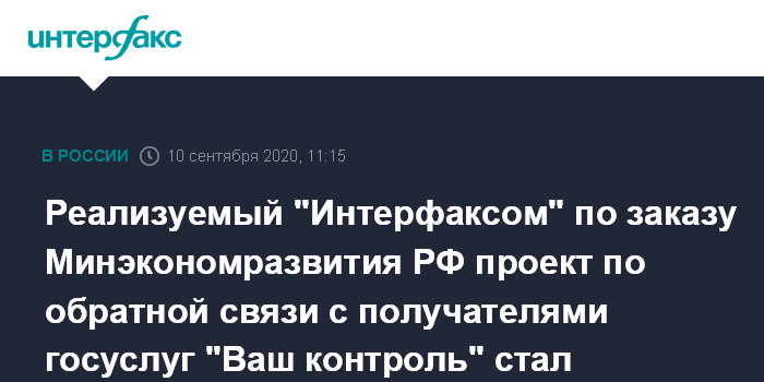 Москва. 10 сентября. INTERFAX.RU - Созданный и развиваемый "Интерфаксом" по заказу Минэкономразвития РФ проект ИАС МУГУ "Ваш контроль", в рамках которого разработана одна из крупнейших в мире онлайн-платформ для обратной связи с населением, стал одним из победителей международного конкурса "WSIS prizes 2020", проводимого под эгидой ООН.