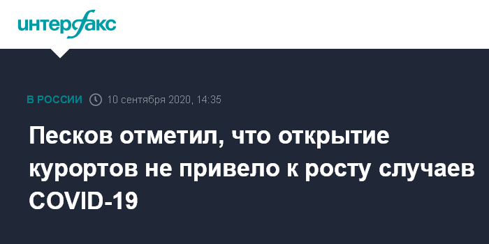 Москва. 10 сентября. INTERFAX.RU - Решение об открытии курортного сезона в регионах РФ не привело к резкому скачку числа инфицированных коронавирусом, сообщил пресс-секретарь президента Дмитрий Песков.