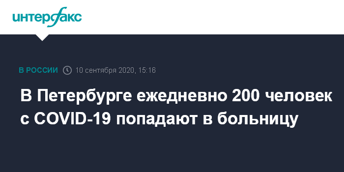 Москва. 10 сентября. INTERFAX.RU - Больницы Санкт-Петербурга ежедневно принимают примерно по 200 человек с диагнозом COVID-19, сообщил журналистам первый зампредседателя городского комитета по здравоохранению Андрей Сарана.