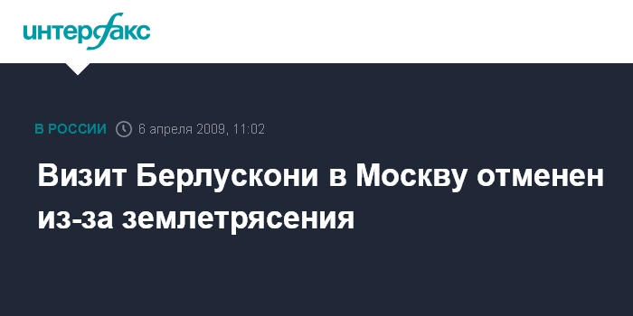 Москва. 6 апреля. INTERFAX.RU – Председатель совета министров Италии Сильвио Берлускони отменяет визит в Россию и направляется в зону, пострадавшую от землетрясения, сообщает интернет-сайт итальянской газеты "Репубблика".